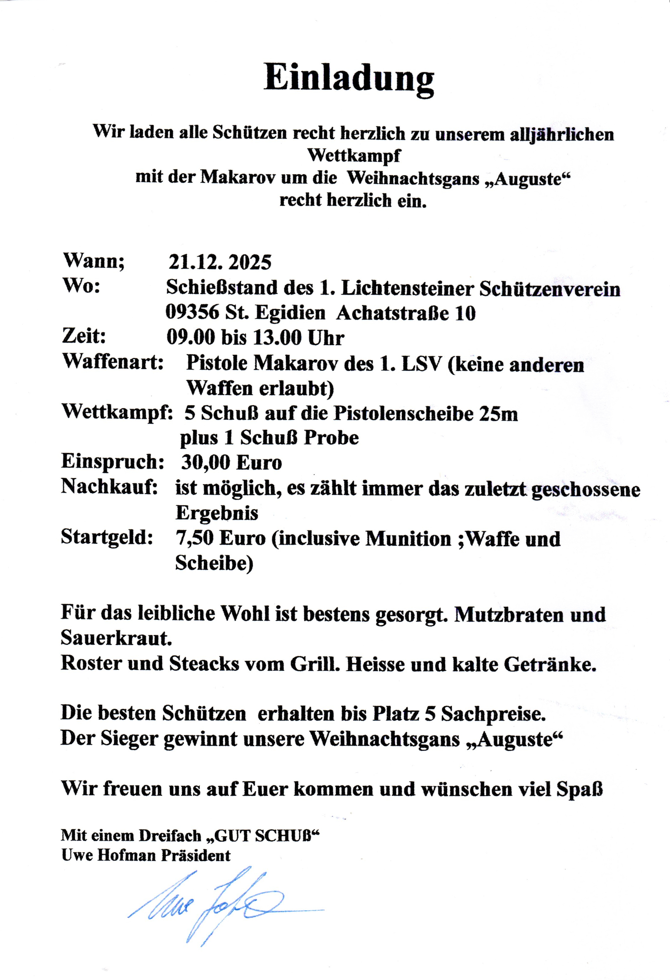 2025Achtung: Ab sofort ist auch amDienstag von 18.30 - 21.00 Uhr geöffnetMakarov-WettkampfAm 21. Dezember von 9.00 - 13.00 UhrAusschreibungWeihnachtsschiessen und WeihnachtsfeierZum Nicolaustag am 6. Dezember haben wir unsere diesjährige Weihnachtsfeier.Natürlich werden vorher, wie jedes Jahr, die Weihnachtsgeschenke ausgeschossen.Der Wettkampf beginnt 14.00 Uhr, die offizielle Weihnachtsfeier 18.00 Uhr. Für Essen und Trinken ist, wie immer, bestens gesorgt.Vereinsmeisterschaft Die Vereinsmeisterschaft findet am 14.-15.11 und am 21.-22.11.2025 statt. Am 14. und 15. werden alle Langwaffen geschossen. Am 21. und 22. werden alle Kurzwaffen geschossen.Arbeitseinsatzam 13. SeptemberFestumzug in St. Egidien7. September Königsschiessen und SchützenfestAm 6. September ab 14.00 Uhr auf dem Gelände des SchiessstandesMitgliederversammlung20. AugustKanonentreffen und SommerfestAm 9. August ab 15.00 Uhr auf dem Gelände des SchiessstandesWettkampf 1. Lichtensteiner Damen Cup21. JuniErgebnisseWettkampf mit LuftgewehrIm ganzen Juni zu den ÖffnungszeitenAusschreibungMitgliederversammlungVorverlegt auf den 7. MaiWettkampf KK-LWAm 10. Mai von 14-17 UhrArbeitseinsatzAm 5. April